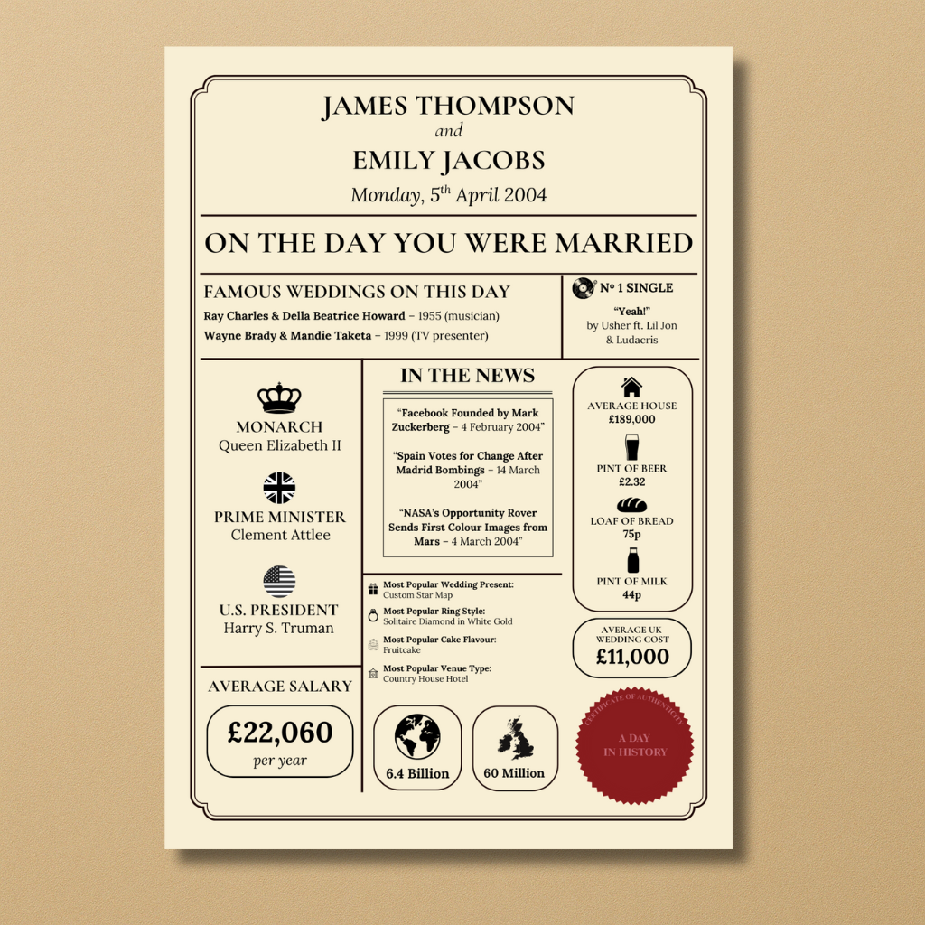From house prices to who topped the charts — this page captures your wedding day in stunning detail. It’s the one you'll frame.